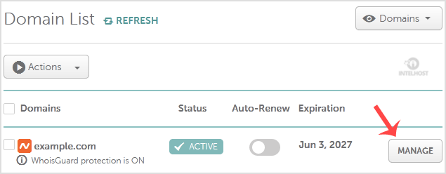 3. Under the domain list, You can see a list of your domains. In front of your domain, click on the Manage button.